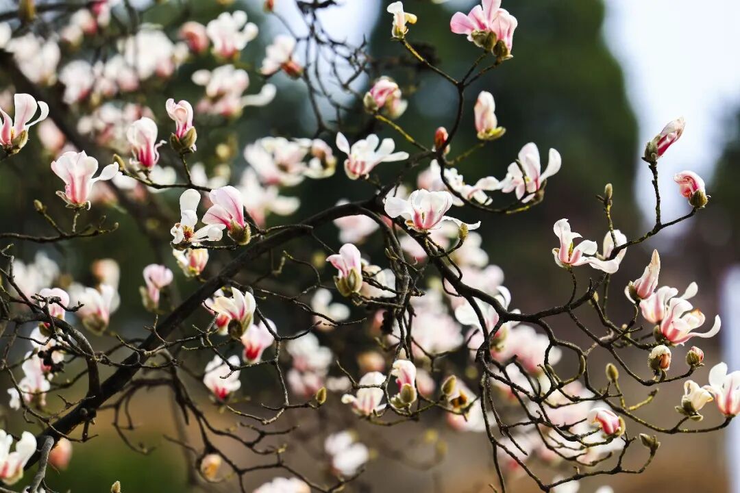 这几棵玉兰枝干挺拔,光秃秃的枝桠上没有一片绿叶,唯有硕大饱满的玉兰花纵情绽放,完美诠释了“先”的生长智慧——早在去年夏季,玉兰的花芽便已悄然孕育,经过整个冬天的休眠蓄力,待气温回暖便破苞而出,抢占早春第一抹风景,被丹东市民誉为“春天第一花”。