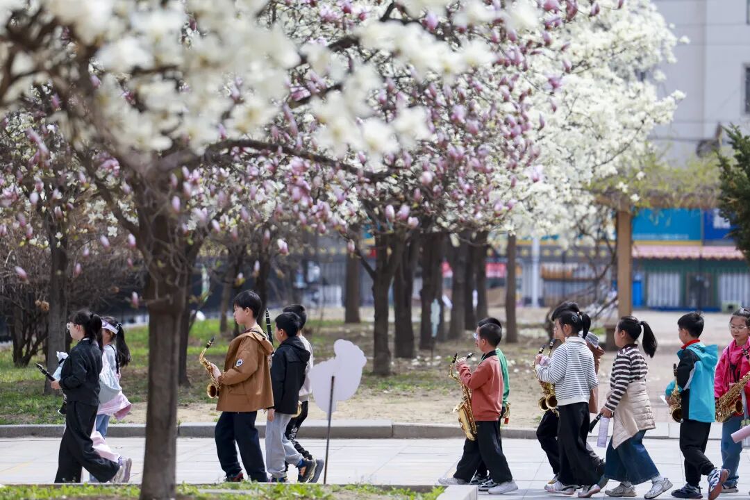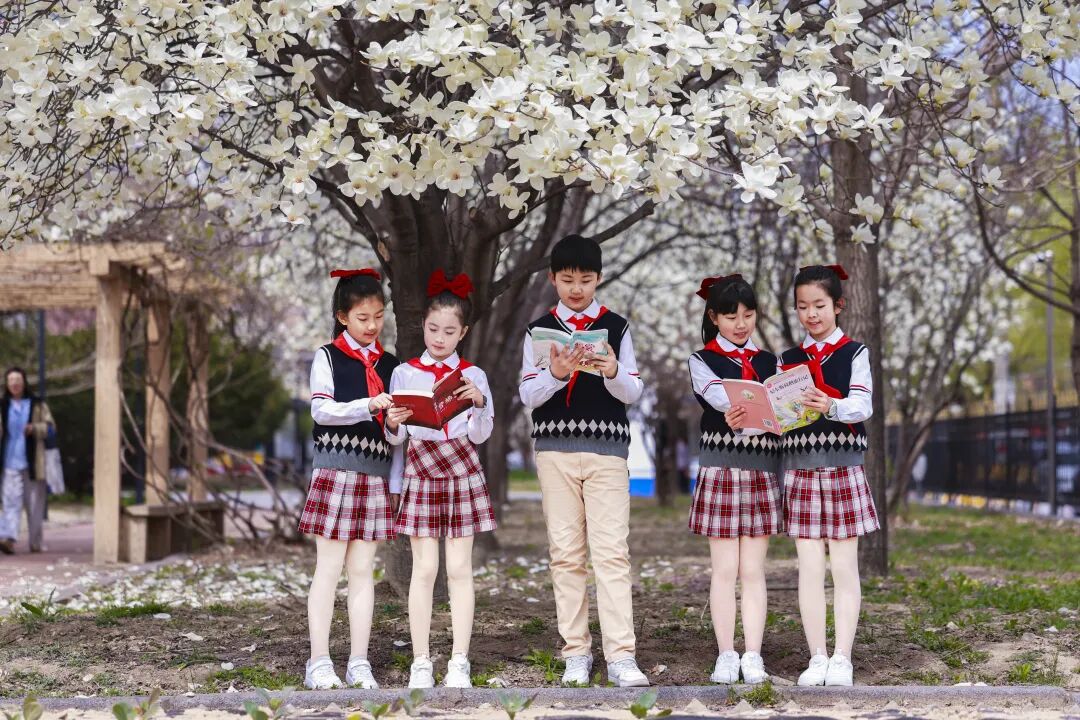 实验小学校园内,玉兰缀满枝桠,清冽花香弥漫校园。下课铃响,学子们踏着春光走出教室,驻足玉兰树下,或仰头赏芳,或轻拾落瓣,或追逐嬉戏,欢声笑语与花香交织,为春日盛景添满朝气。