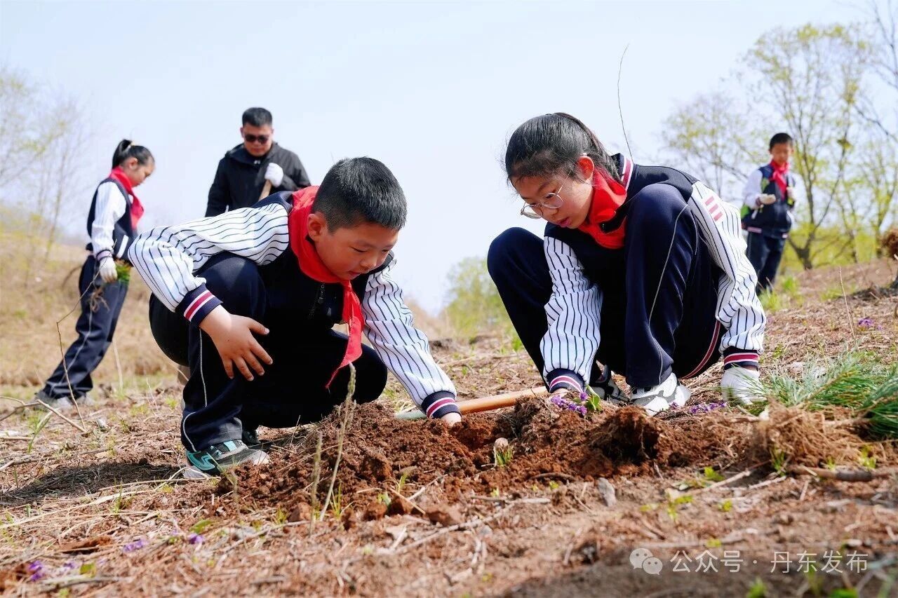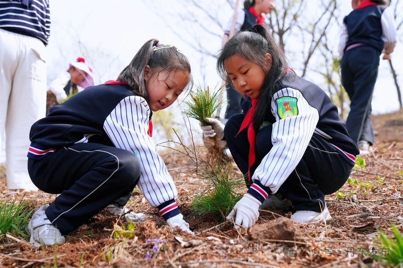 活动当日,山林间春意盎然。少先队员们身着校服、佩戴红领巾,在老师与林场工作人员的引导下,与家长默契配合、分工协作。挖坑、扶苗、填土、压实……每一个植树环节,大家都认真细致、井然有序。