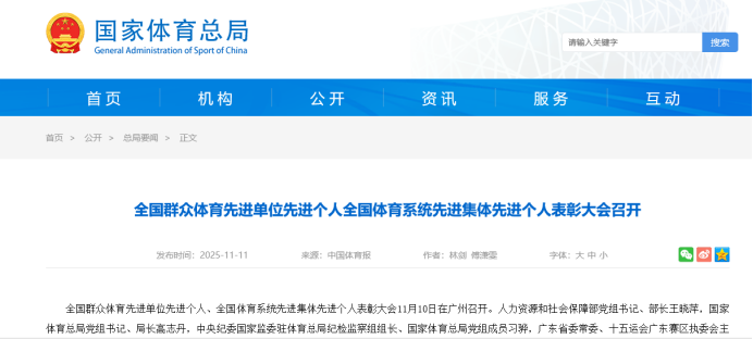 11月10日,国家体育总局与人力资源和社会保障部在广州联合举行2021-2024年度全国群众体育先进单位和先进个人表彰大会,隆重表彰近年来在全民健身事业中作出突出贡献的先进典型。本次表彰共授予3182个单位“全国群众体育先进单位”称号,2356人“全国群众体育先进个人”称号。其中,丹东市7单位、3个人光荣上榜,用实干实绩为“鸭绿江畔 丹东真好”的城市名片增添体育亮色。
